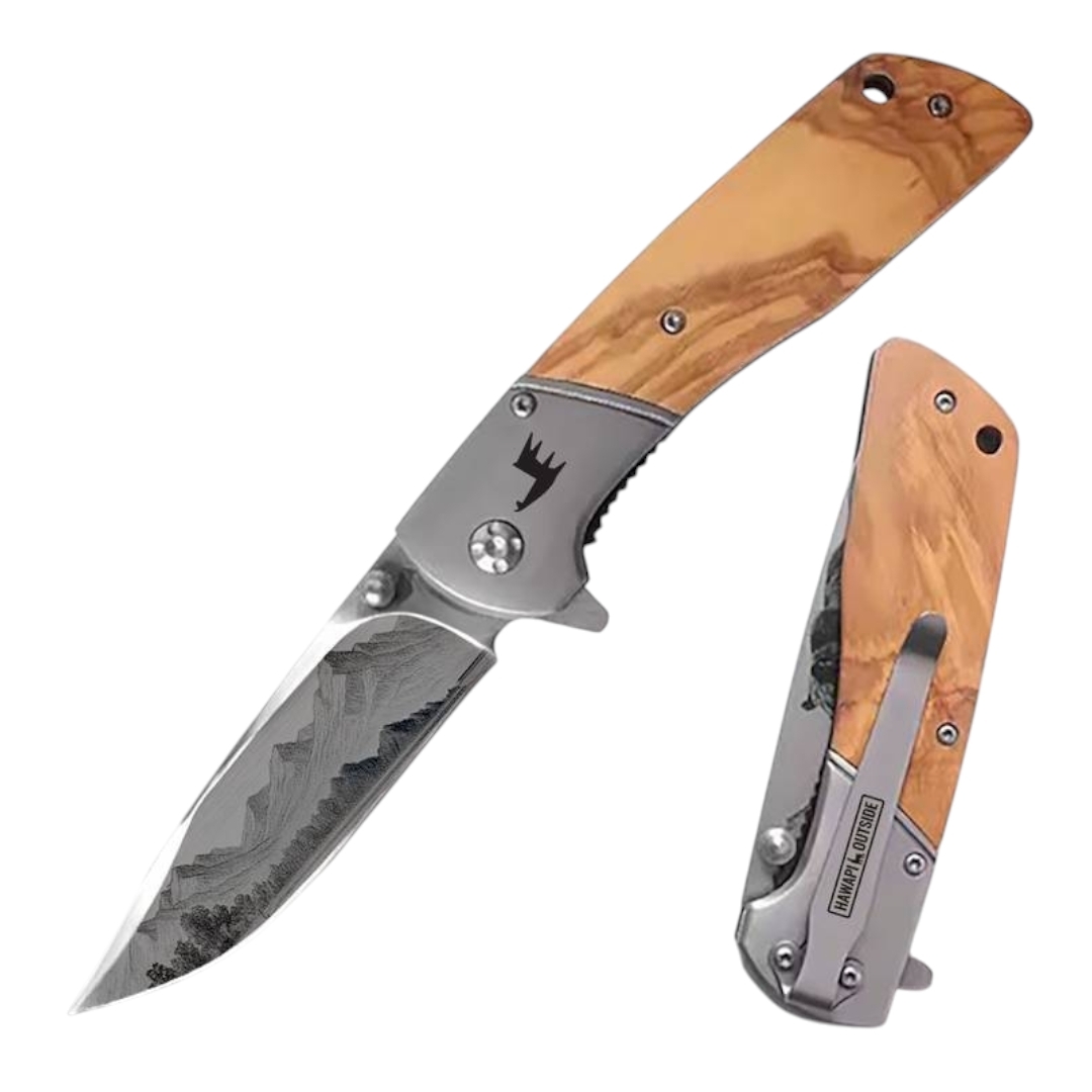 Design tradicional com toque rústico. Lâmina afiada com ilustração gravada, abertura suave e cabo em madeira, estilo clássico com personalidade.