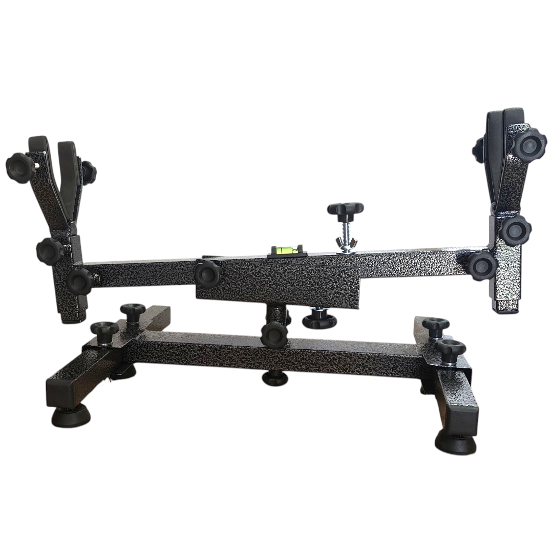 Nossa estativa é de fabricação própria, com pintura epóxi que tem maior durabilidade e proteção contra intempéries, itens de acabamento de alto nível, apoios de solo emborrachados e com regulagens , pinças de apoio da arma emborrachado e com travas e que podem ser alongados conforme o comprimento e altura desejada , conta também com regulagem de nível.